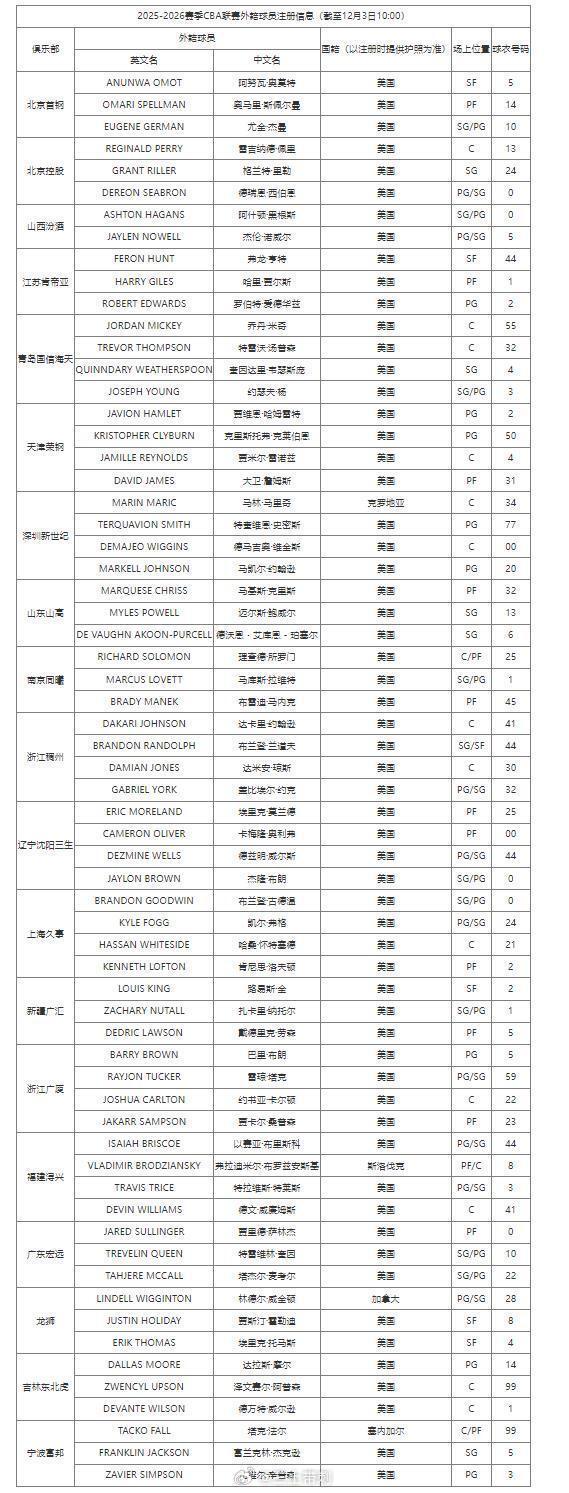 CBA官宣外援注冊:遼寧等8隊4外援 京粵等10隊3外援 四川0外援